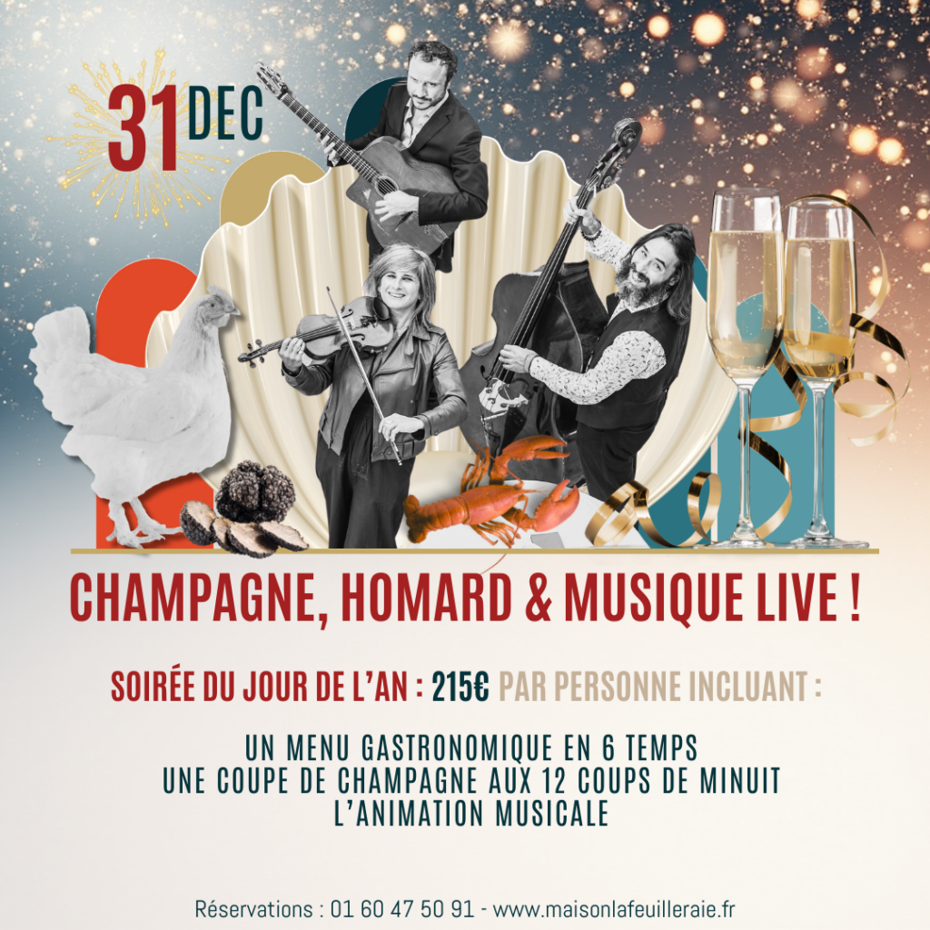 La soirée sera festive ! Un menu gastronomique réalisé à 4 mains par nos chefs Guillaume LAMORY et Ludovic DUPONT ponctuera en 6 étapes l’avancée des aiguilles jusque minuit ! Homard, Saint-Jacques, foie gras, truffe, volaille de Bresse… Ce beau dîner de fête s’appréciera en musique et en chansons ! Mêlant avec audace et bonne humeur musique tzigane, chansons françaises et jazz manouche, la violoniste Aurore Voilqué et ses 3 musiciens vous accompagneront musicalement toute la soirée !